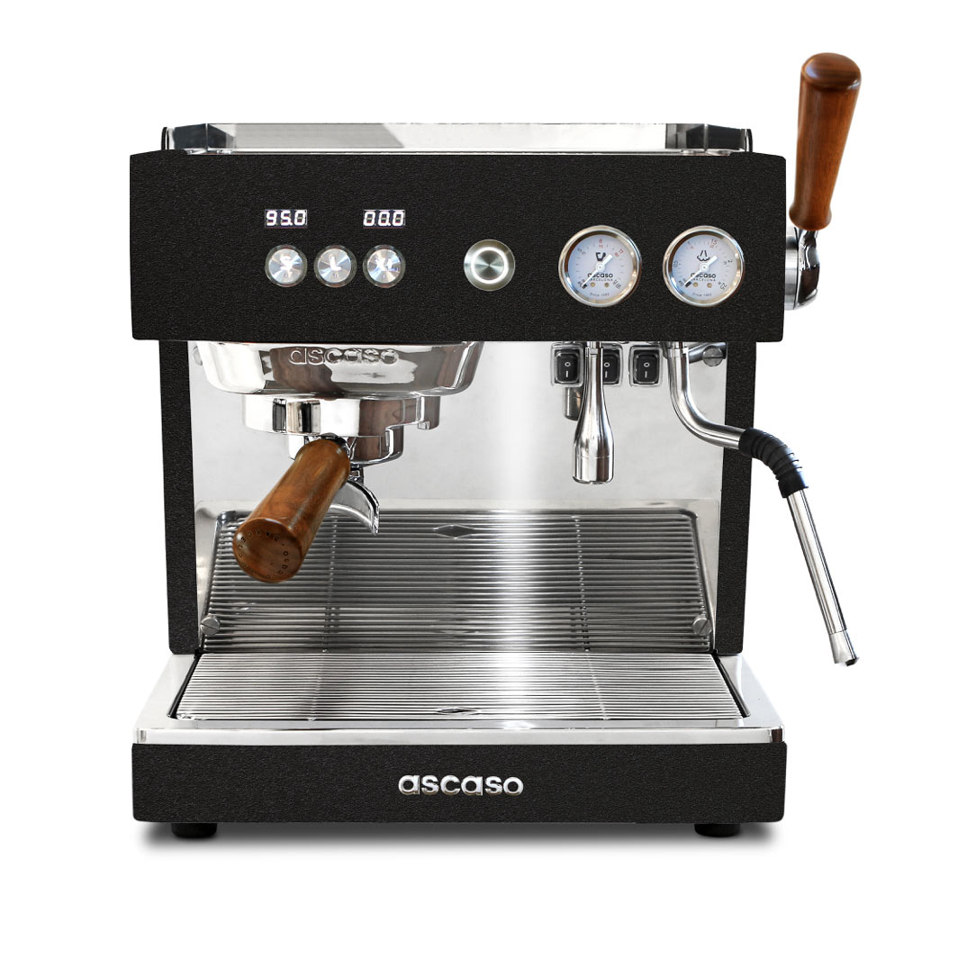 High End Maschine mit Multi-Element Technologie, unabhängigem 2,5 l Serviceboiler aus Edelstahl, PID Kontrolle, Shot-Clock, programmierbaren Portionstasten (volumetrisch), Joystick für den Dampf, Profi-Thermoblock Brühgruppe, Vibrationspumpe, 2 l Wassertank, separatem Heißwasserauslass, LED Barista-Lights, Holz-Accessoires und der neuen ascaso App-Steuerung.
