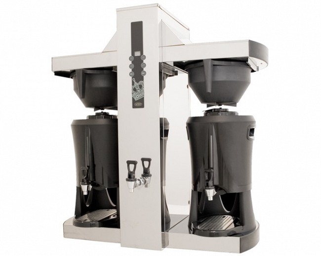 Coffee-Queen Serving Double Tower – Der solide und platzsparend designte Coffee-Queen Double Tower lässt sich direkt mit dem Festwasseranschluss verbinden. So ist auch bei längerem Betrieb kein manuelles Nachfüllen erforderlich. Die schlank gestaltete Servicestation im glänzenden Edelstahl-Design verfügt über zwei Brüharme, die eine gleichzeitige Nutzung unterstützen. Zudem gibt es einen separaten Zapfhahn für Heißwasser. Ein weiterer Pluspunkt ist der Drehboden, der Ihnen und Ihren Gästen die Bedienung noch leichter macht.