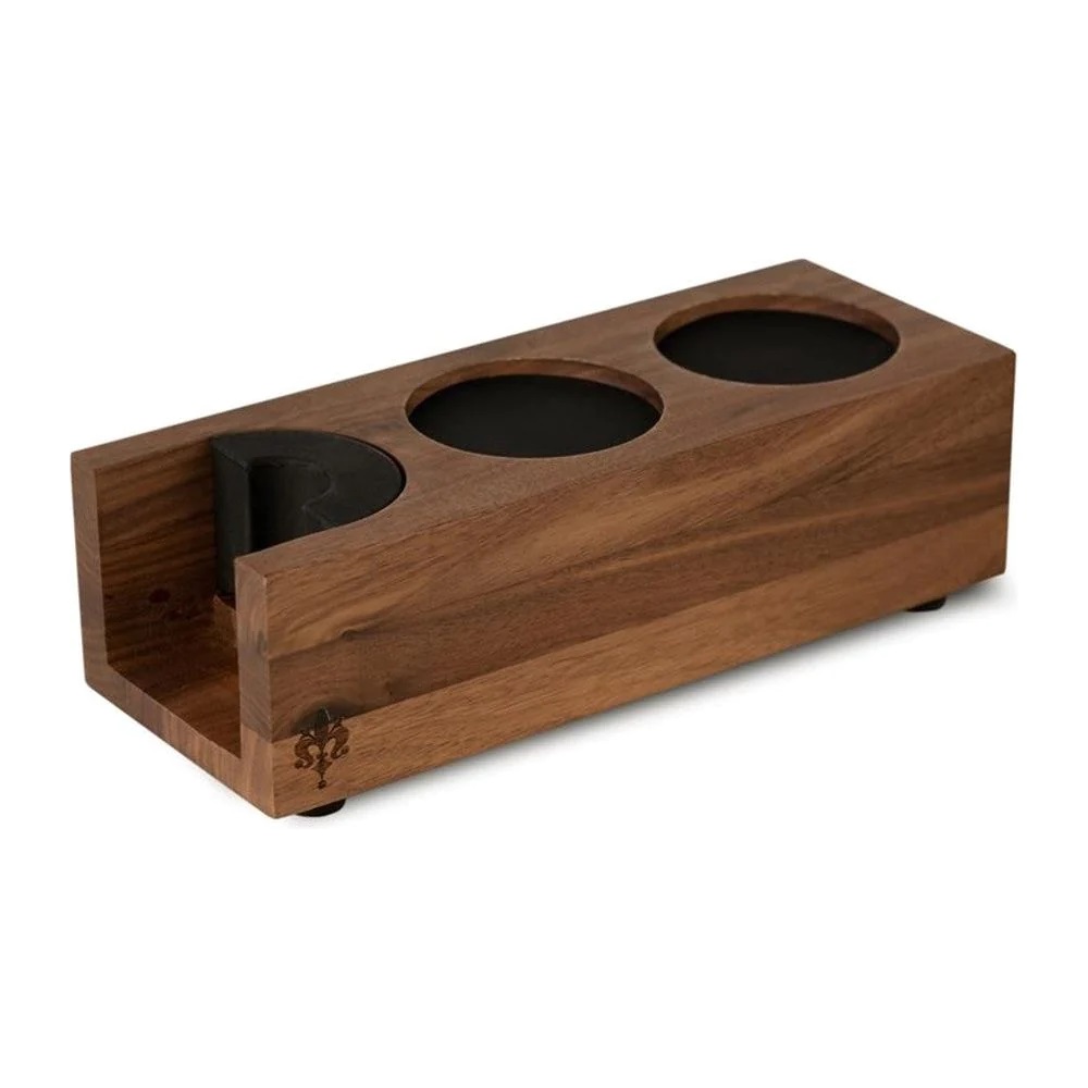 Premium-Oberflächen, anpassbar in zwei Konfigurationen: Nussbaum oder natürliche Eiche. Perfekt kompatibel mit Eureka-Tampern und Leveler.